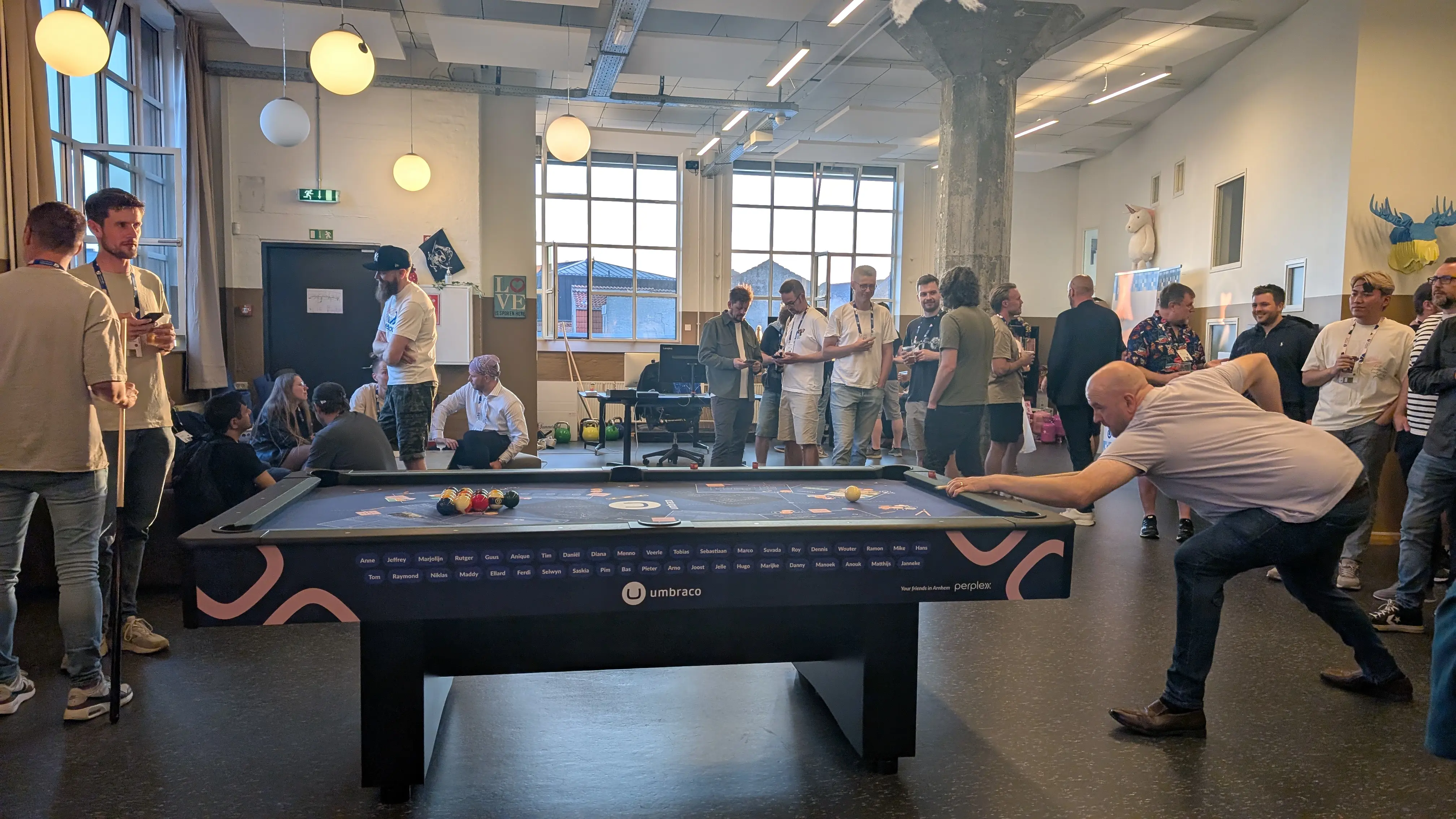 After Storms, we went over to Umbraco HQ for the pre-party. I wanted to make Sarah welcome and introduce her to lots of people, I did do that and with Kat too, but there was a distraction this year, in the form of a pool table. The wonderful team at Perplex had bought a pool table for the HQ team. It was a great way for me to chat to people and loosen up and relax whilst playing a game that I love. I managed to stay on for a while but I'm sure after some time people were wanting me to lose which inevitably happened.