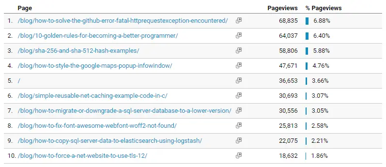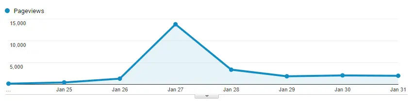 After about 4 or 5 months of creating articles and not many people reading them, I was inspired on my lunch break at work to write a post called 10 golden rules for becoming a better programmer. I had heard that list style posts were popular and opinionated posts seemed to divide people so that people who liked it shared it and those who didn't like also shared it, even just to tell people that they disagreed with it. Anyway this post was a bit of a hit with the programming community. I put it on social sites like facebook, twitter and LinkedIn Groups. I also shared it on Hacker News which was a good move because it stayed on the front page for most of the day. In one day that post got nearly 14,000 page views and within the space of a week it had around 25,000 page views.